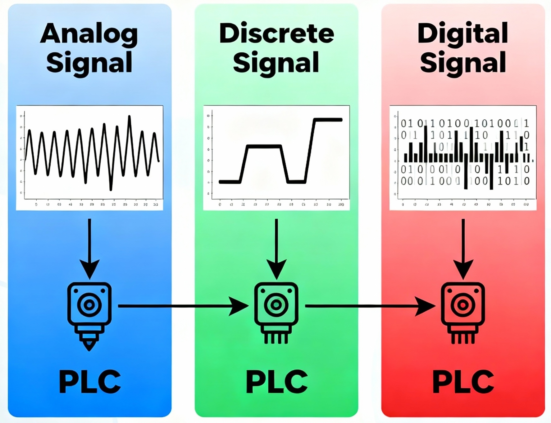 - Дискретные сигналы используются для информирования системы о наступлении определённых событий. Простой пример — концевой выключатель на двери шкафа: когда дверь открыта, контакт разомкнут — ПЛК получает логический “0”, когда закрыта — “1”. Индуктивные и фотоэлектрические датчики в транспортерах и станках также чаще всего подают дискретные сигналы, отражая наличие или отсутствие объекта.