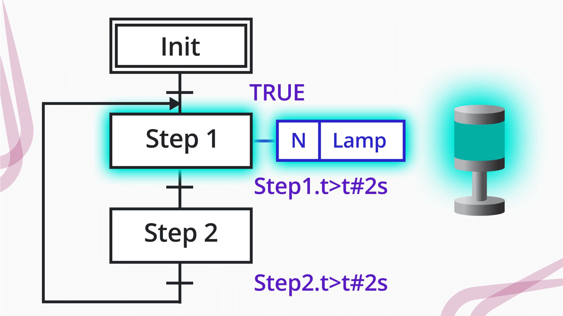 Условие перехода Step1.t>t#2s — переход от Step 1 к Step 2 происходит, когда время нахождения в шаге превышает 2 секунды. Это встроенный таймер шага, который отсчитывает время активности.