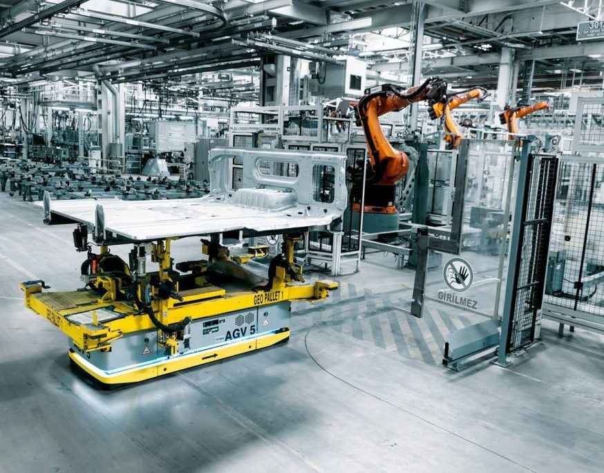 Автоматизированные тележки (AGV) служат основным средством межцеховых перевозок, обеспечивая гибкую маршрутизацию грузов между удалённых друг от друга рабочих станций, промежуточными буферными складами и цехами. Благодаря возможности программного переопределения маршрутов, AGV идеально подходят для переменчивых производственных сценариев, когда требуется частая смена типов обрабатываемых деталей или перекомпоновка производственного потока. Они обеспечивают высокую гибкость, хотя производительность одной тележки относительно невысока.