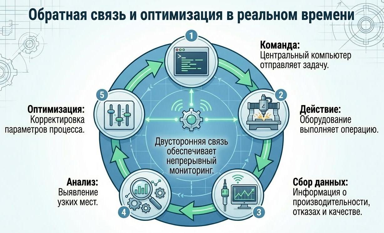 Система непрерывно отслеживает производство в реальном времени, собирает данные о производительности, отказах, качестве продукции, использовании ресурсов. Анализ этих данных позволяет оптимизировать параметры процесса и выявлять узкие места.