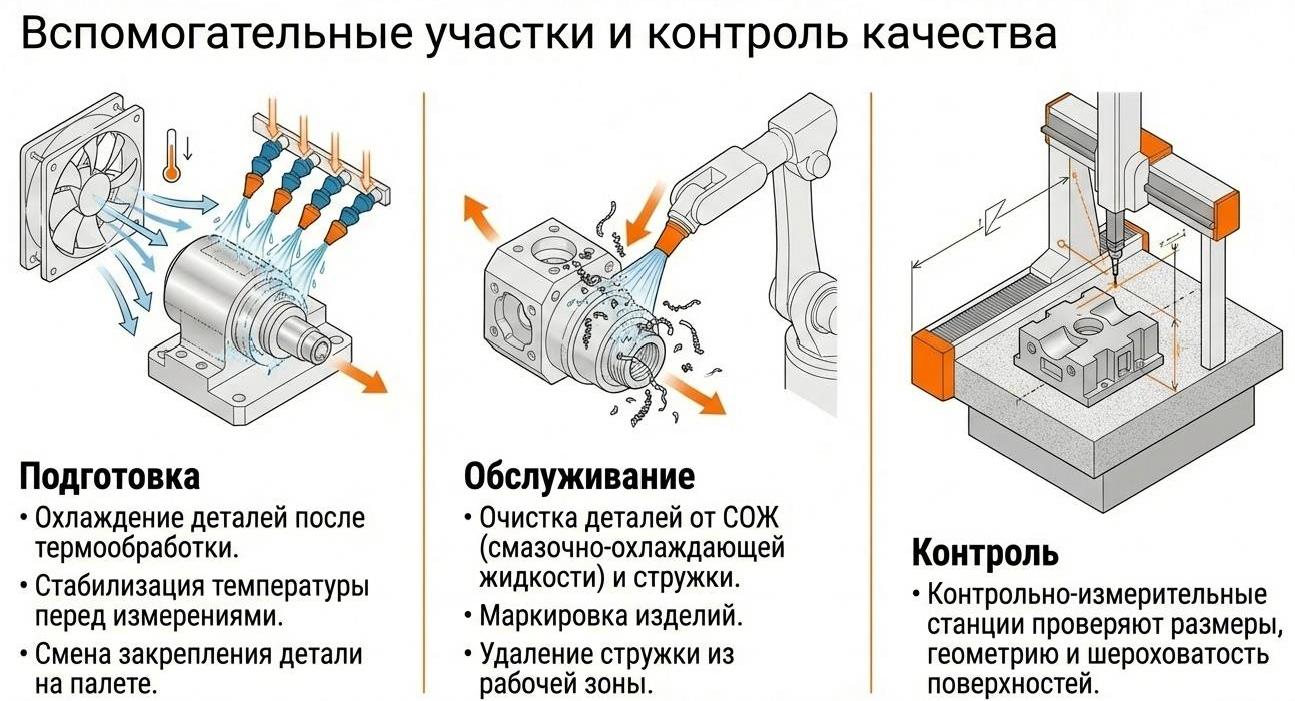 Вспомогательные станции обеспечивают очистку деталей от СОЖ и стружки, маркировку, техническое обслуживание оснастки, удаление стружки из рабочей зоны. Контрольно-измерительные станции проверяют размеры обработанных поверхностей, геометрию, шероховатость.