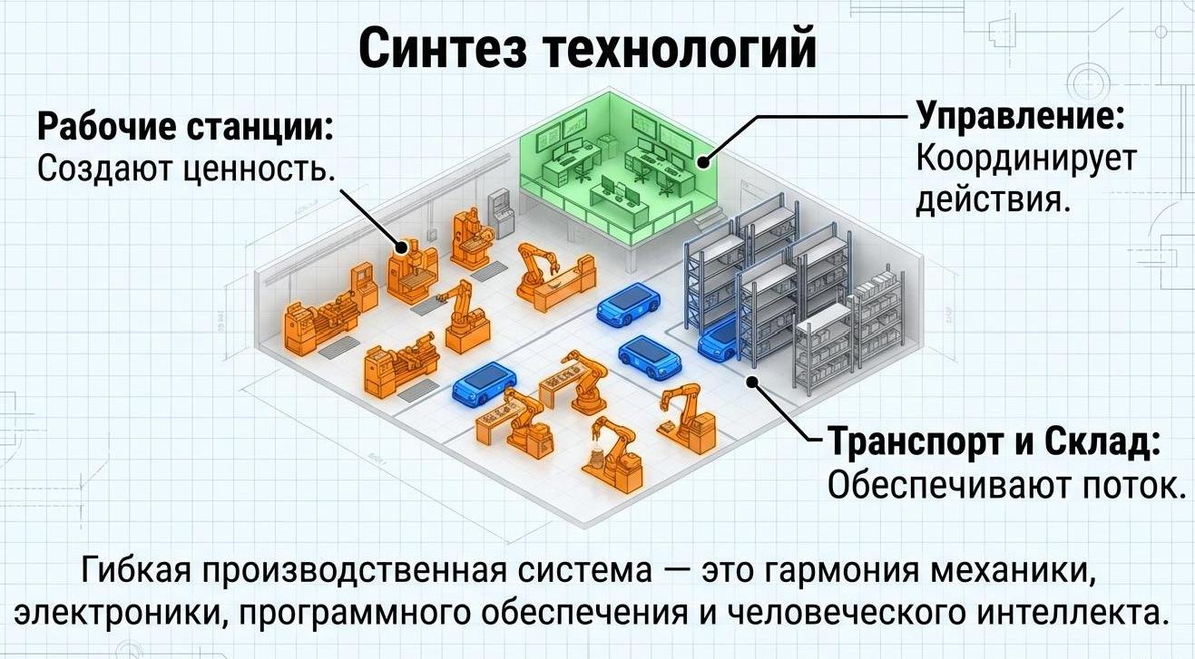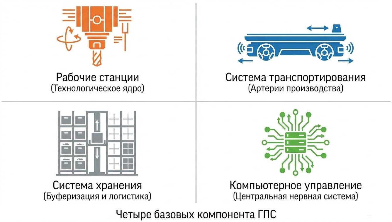 Гибкая производственная система состоит из четырёх взаимосвязанных подсистем, обеспечивающих интегрированную автоматизированную работу. Каждый компонент выполняет специфическую функцию, но успех системы определяется бесшовной интеграцией всех элементов.