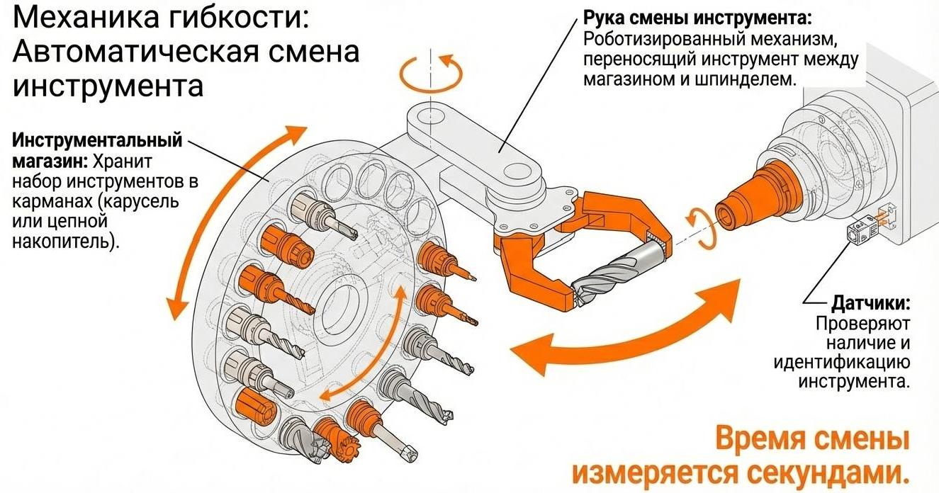 Автоматическое устройство смены инструмента состоит из нескольких ключевых компонентов. Инструментальный магазин хранит набор инструментов в карманах, расположенных по окружности карусели или вдоль цепного накопителя.