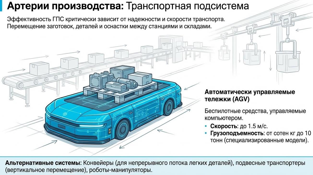 Транспортная подсистема перемещает заготовки, детали, инструмент и оснастку между рабочими станциями, складами и участками загрузки-выгрузки. Эффективность всей ГПС критически зависит от надёжности и скорости транспортной системы.