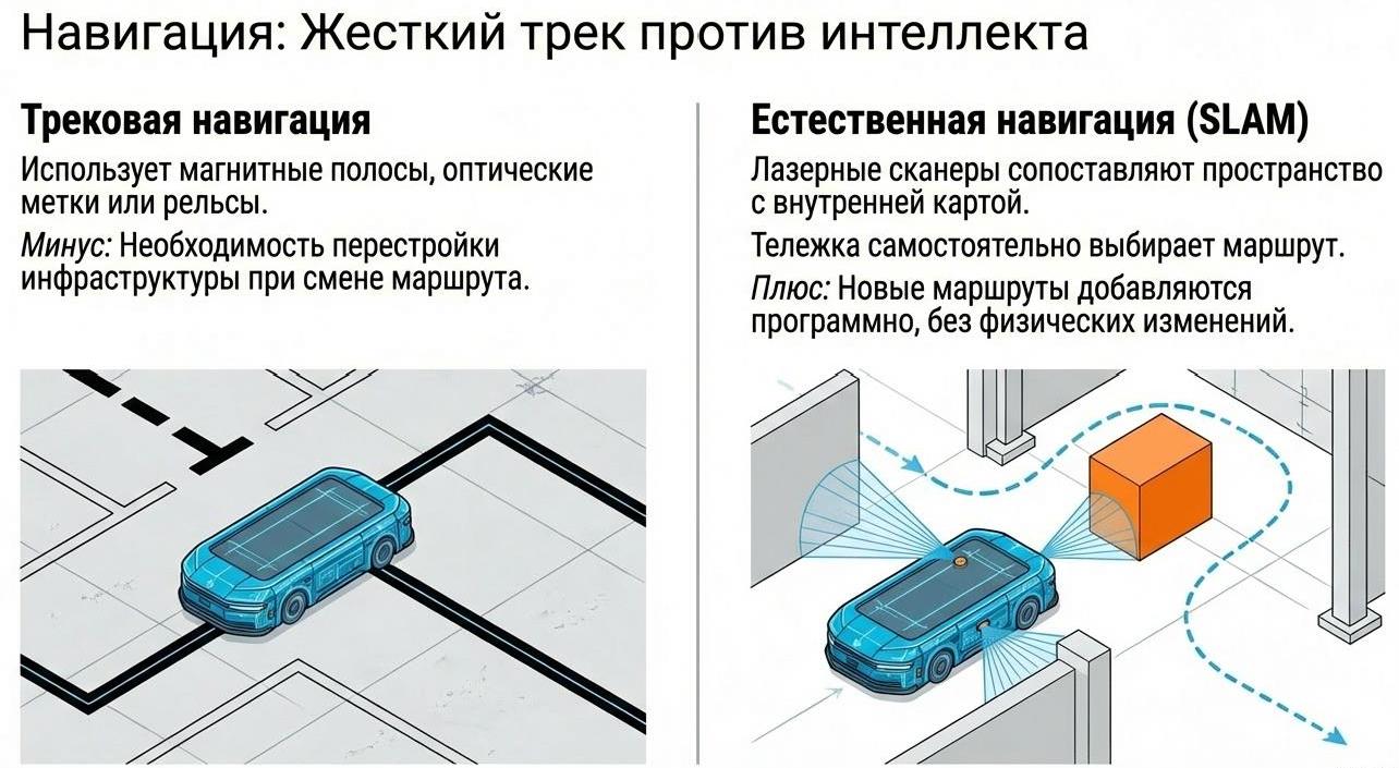 Существуют два основных типа навигации. Трековая навигация использует физические направляющие - магнитные полосы, оптические метки, направляющие рельсы. Датчики тележки следуют по этой траектории к заданному пункту назначения. Недостаток - необходимость заблаговременного планирования сети маршрутов и высокая стоимость последующих изменений.