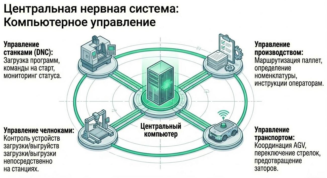 Центральная компьютерная система координирует работу всех компонентов ГПС, обеспечивая бесперебойное функционирование производства. Система выполняет несколько взаимосвязанных функций.