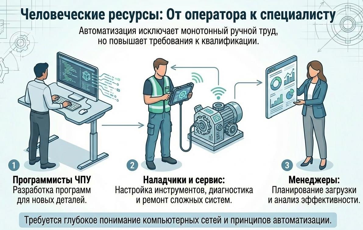 Квалификация персонала ГПС существенно выше, чем на традиционных участках механообработки. Требуется понимание программирования ЧПУ, компьютерных сетей, принципов автоматизации, методов диагностики неисправностей. Это повышает требования к обучению, но снижает численность персонала и исключает монотонный ручной труд.