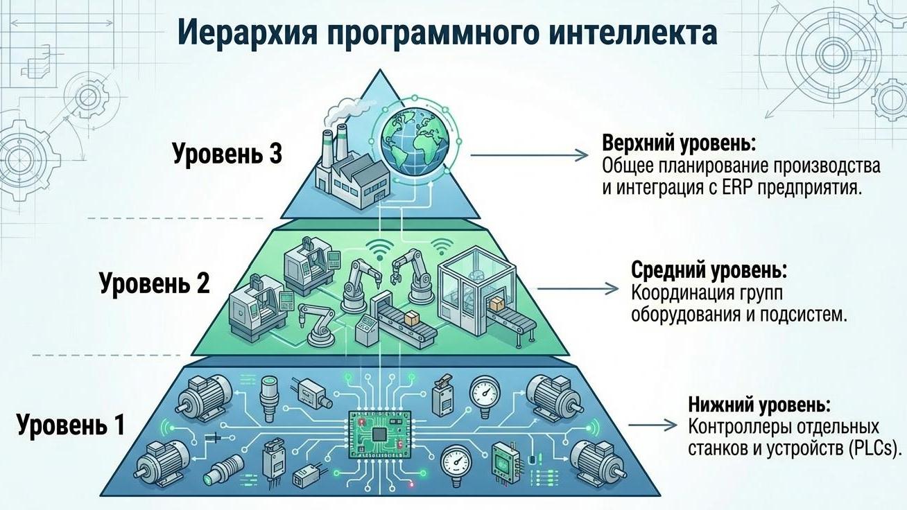 Модульная структура программного обеспечения изображается в виде иерархии уровней. Нижний уровень - контроллеры отдельных станков и устройств. Средний уровень - координация групп оборудования и подсистем. Верхний уровень - общее планирование производства и интеграция с системами управления предприятием.