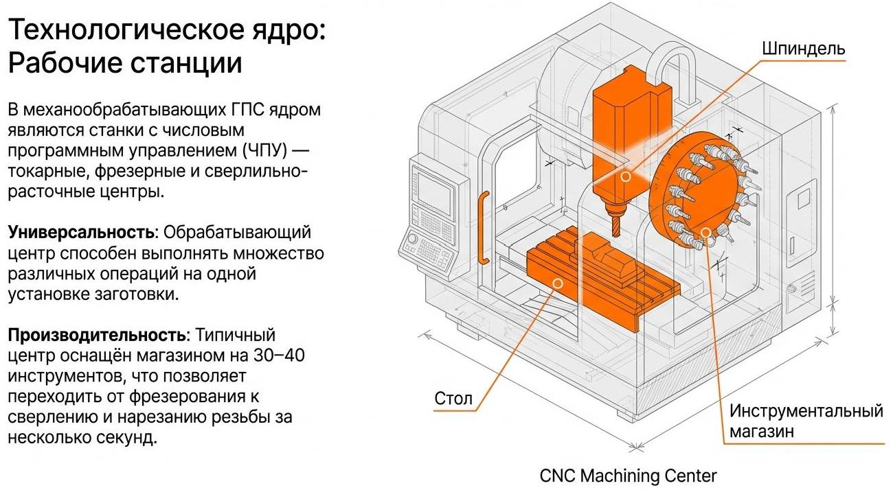 Рабочие станции представляют собой технологическое ядро системы, где выполняется собственно обработка или сборка изделий. В механообрабатывающих ГПС это станки с числовым программным управлением - токарные, фрезерные, сверлильно-расточные обрабатывающие центры.