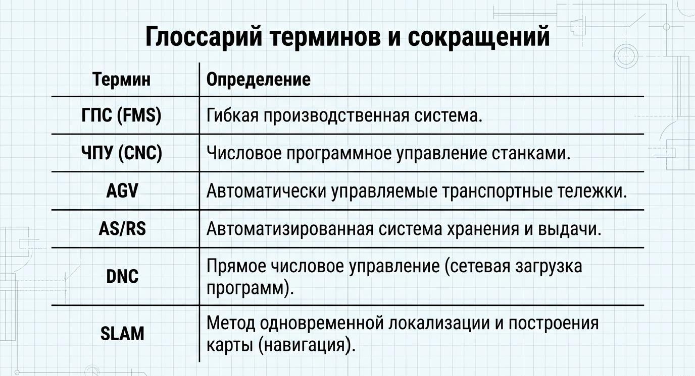 Гибкая производственная система (ГПС) - это комплекс автоматизированного оборудования и вычислительной техники, способный к автоматической переналадке для производства изделий разной номенклатуры в рамках заданных характеристик.