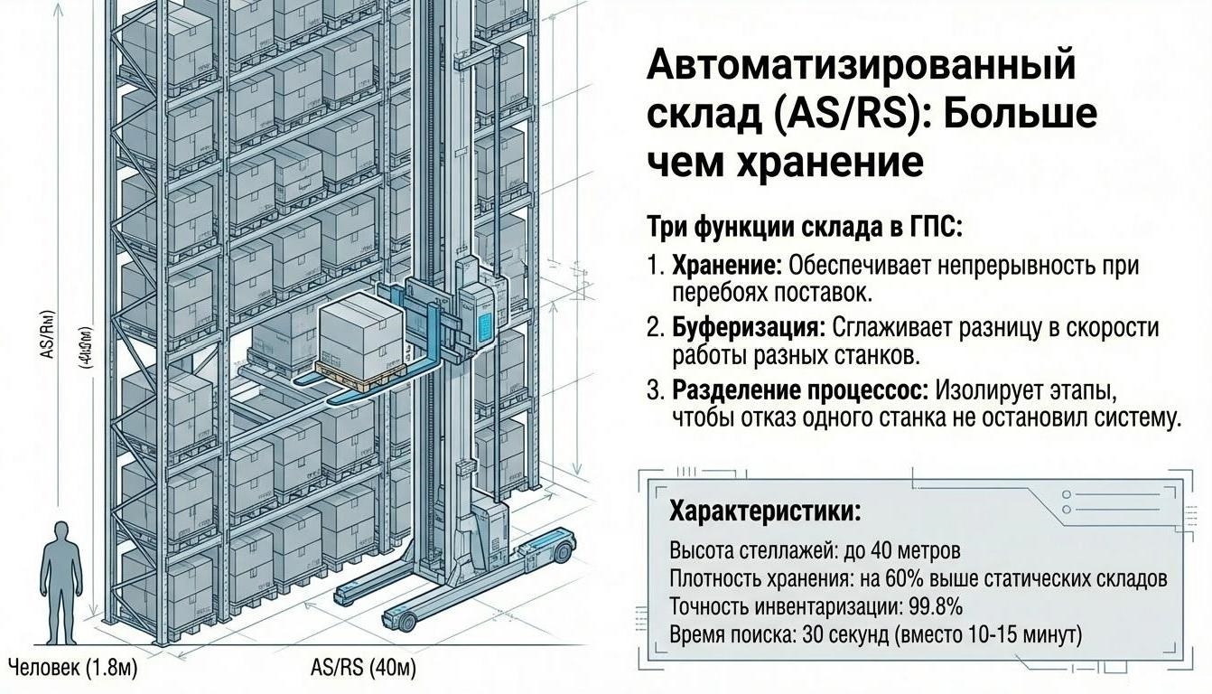Автоматический склад выполняет три функции в составе ГПС. Хранение обеспечивает непрерывность производства независимо от колебаний поставок сырья. Буферизация сглаживает различия в скорости и ритме соседних технологических участков. Разделение процессов изолирует производственные этапы, чтобы отказ одного станка не парализовал всю систему.