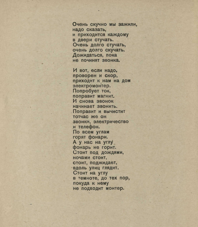 Стихотворение построено из нескольких бытовых сценок, в каждой из которых электромонтёр спасает положение: