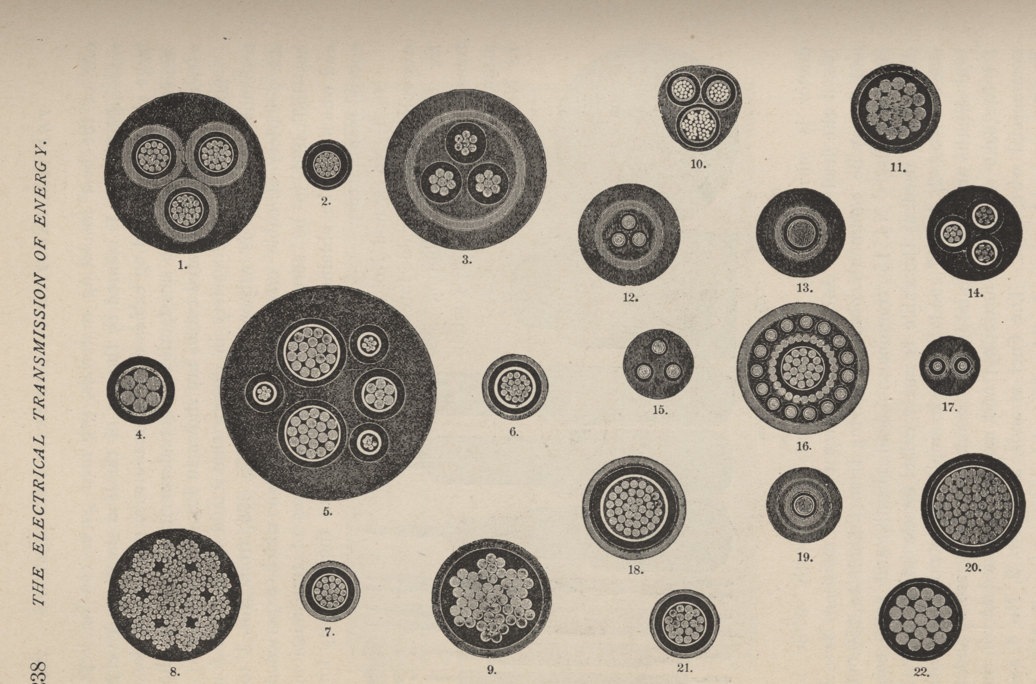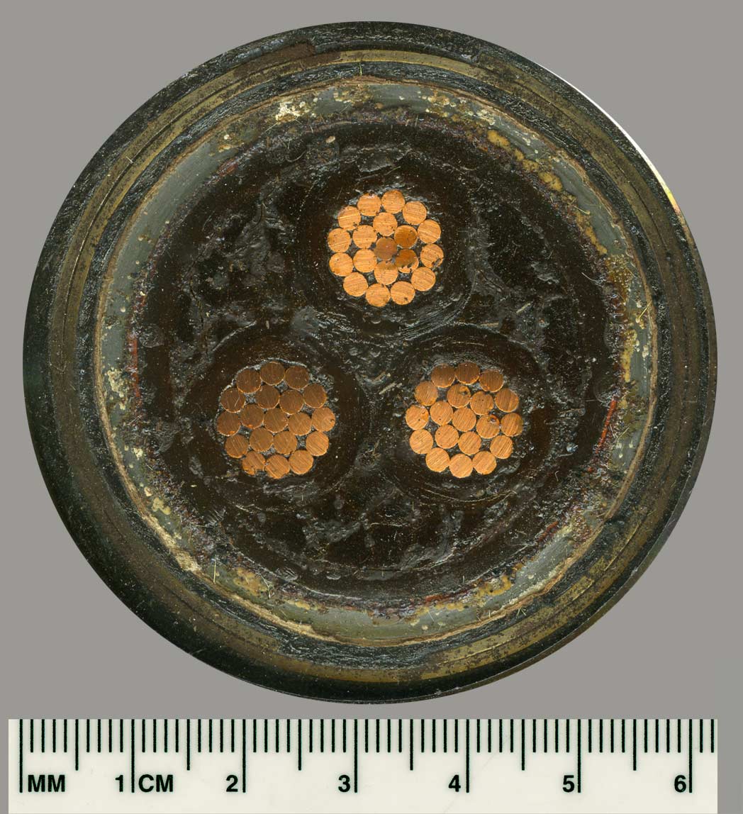 Кабель Siemens Brothers & Co Limited (Лондон): трехжильный силовой кабель напряжением 33000 В для River Plate Electricity Co., проложенный в 1901 г. с свинцовой оболочкой, небронированный