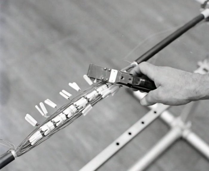 Ремонт начинался с тщательной разбора поврежденного участка: свинцовую оболочку аккуратно разрезали специальными ножами, чтобы избежать деформации жил, затем удаляли деградировавшую бумажную изоляцию, пропитанную канфольным маслом, и зачищали медные жилы от окислов; после этого жилы обматывали новой крепированной бумагой (толщиной 0,1-0,2 мм, с перекрытием 50%), которая предварительно пропитывалась маслом на месте с помощью шприцев или вакуумных камер для удаления воздуха и обеспечения однородности, — этот этап мог занимать 2-3 часа из-за необходимости полного пропитывания, чтобы избежать пустот, вызывающих пробои под напряжением.