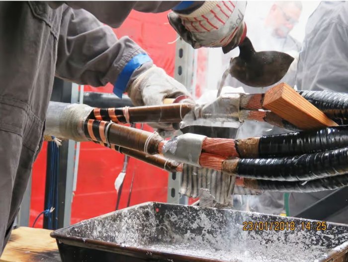 Однако заливка битума требовала предварительного нагрева материала до 150-200°С в специальных котлах с контролем температуры, чтобы избежать газовых пузырей и трещин, — этот процесс был не только опасным из-за риска ожогов и пожара, но и крайне трудоемким, занимая до 6-8 часов на муфту и требуя команды из 3-4 человек с использованием тиглей и форм, что часто приводило к простоям электроснабжения на сутки; свинец, в свою очередь, обладал высокой токсичностью при парообразовании, тяжелым весом (плотность 11,3 г/см?, что увеличивало нагрузку на монтажников на 50-70 кг за муфту) и склонностью к коррозии в агрессивных грунтах, что стимулировало переход к более безопасным полимерным альтернативам в середине века.