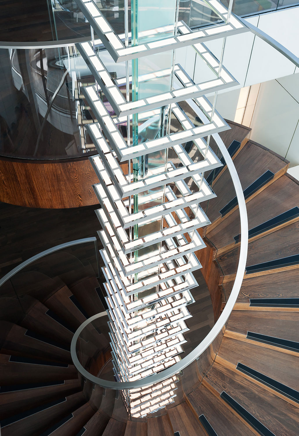 В лобби и коридорах используют полноразмерные OLED-окна, подстраивающие цветовую температуру под биоритмы жильцов. Утренний холодный свет стимулирует пробуждение, дневной — активность, вечерний тёплый свет помогает расслабиться. Эксперимент показал сокращение потребления энергии на 15% за счёт оптимизации искусственного освещения в дневное время.