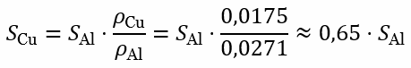 При той же длине L и том же токе I соотношение сечений, при котором потери одинаковы, определяется соотношением удельных сопротивлений: