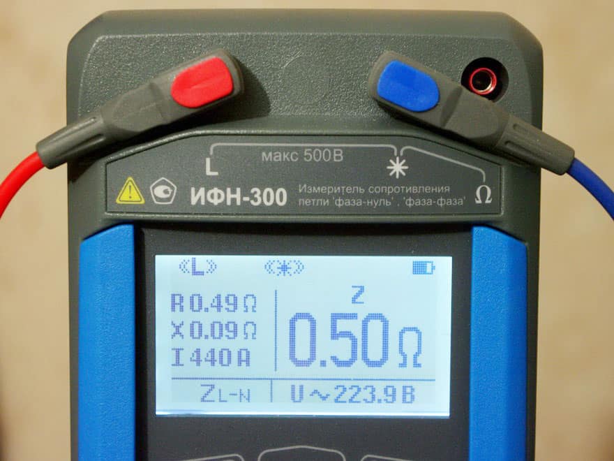 По результатам замеров ИФН-300 отображает одновременно активную и реактивную составляющие сопротивления петли. Повышенная реактивная составляющая при нормальной активной - признак высокой индуктивности петли, что бывает при разносе фазного и PE-проводников по разным трассам. Повышенная активная при нормальной реактивной - признак высокого переходного сопротивления в соединениях или недостаточного сечения проводника.
