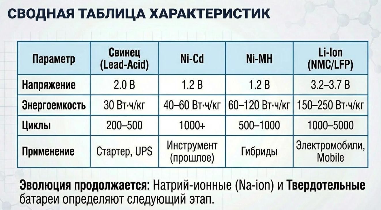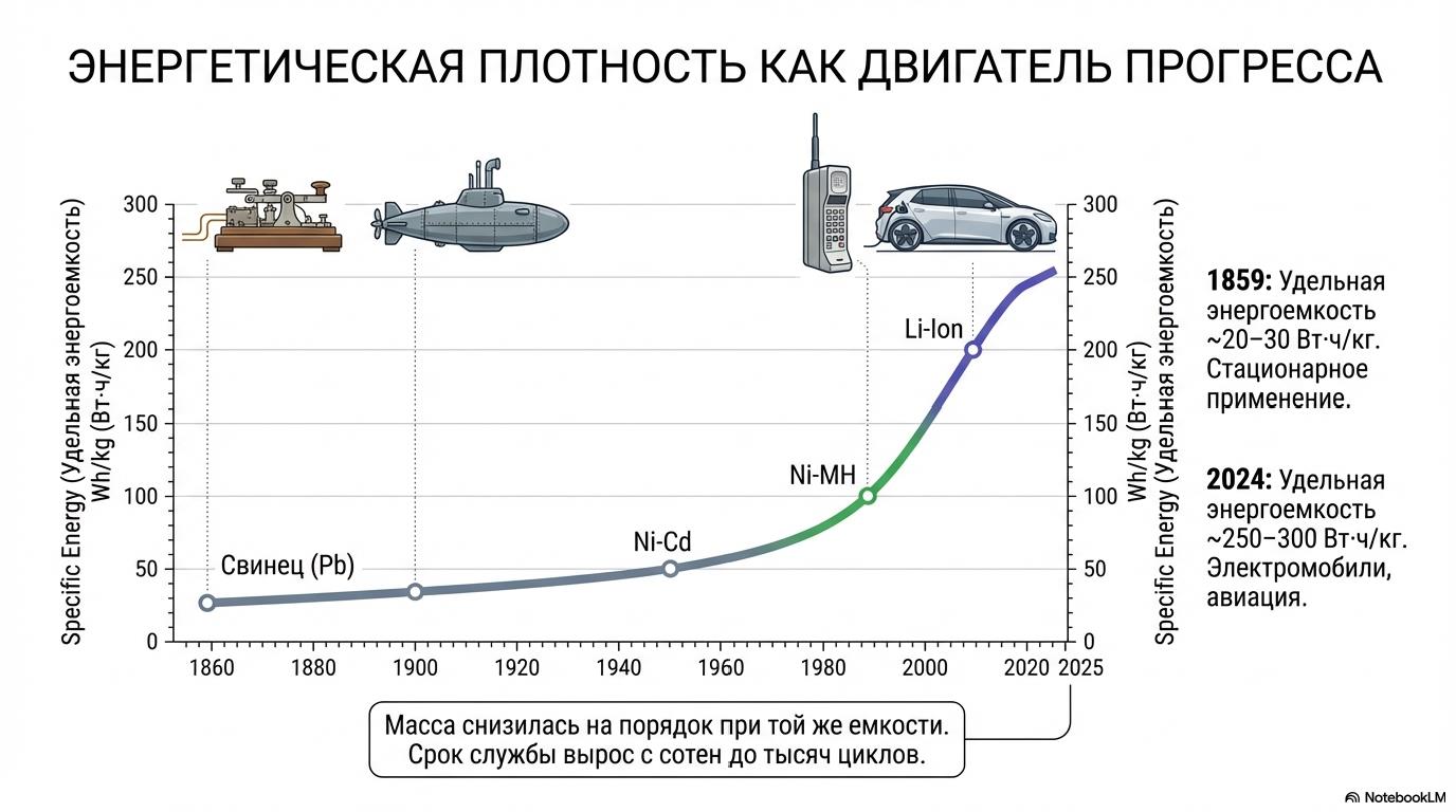 За полтора столетия эволюции удельная энергия аккумуляторов выросла с 20-30 Вт·ч/кг у свинцовых до 250-300 Вт·ч/кг у литий-ионных, срок службы увеличился с сотен до тысяч циклов заряда-разряда, а масса снизилась на порядок при той же емкости.