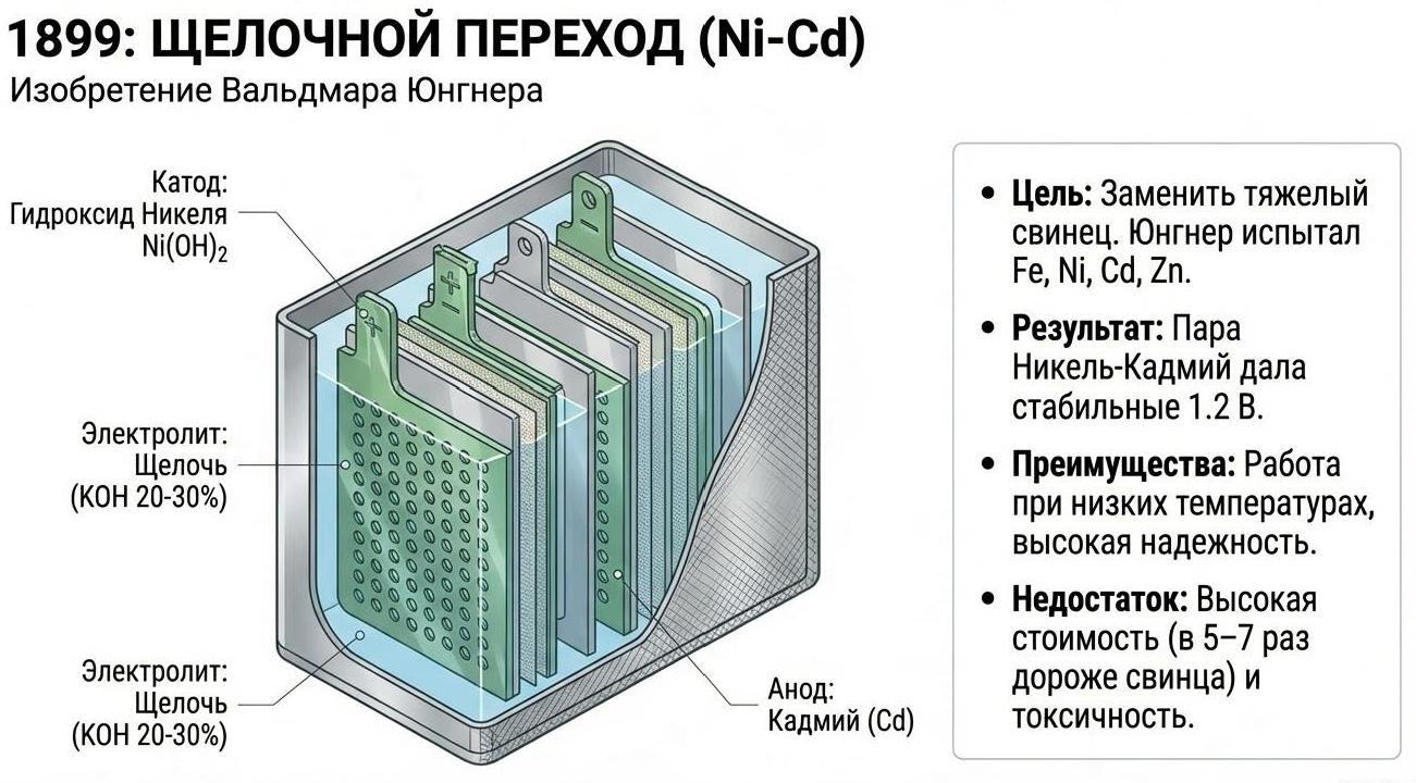 В 1899 году, на исходе XIX столетия, шведский изобретатель Вальдмар Юнгнер (Waldemar Jungner, 1869-1924) запатентовал никель-кадмиевый аккумулятор - первую щелочную систему, превосходящую свинцовые по удельной энергии, числу циклов и морозостойкости.