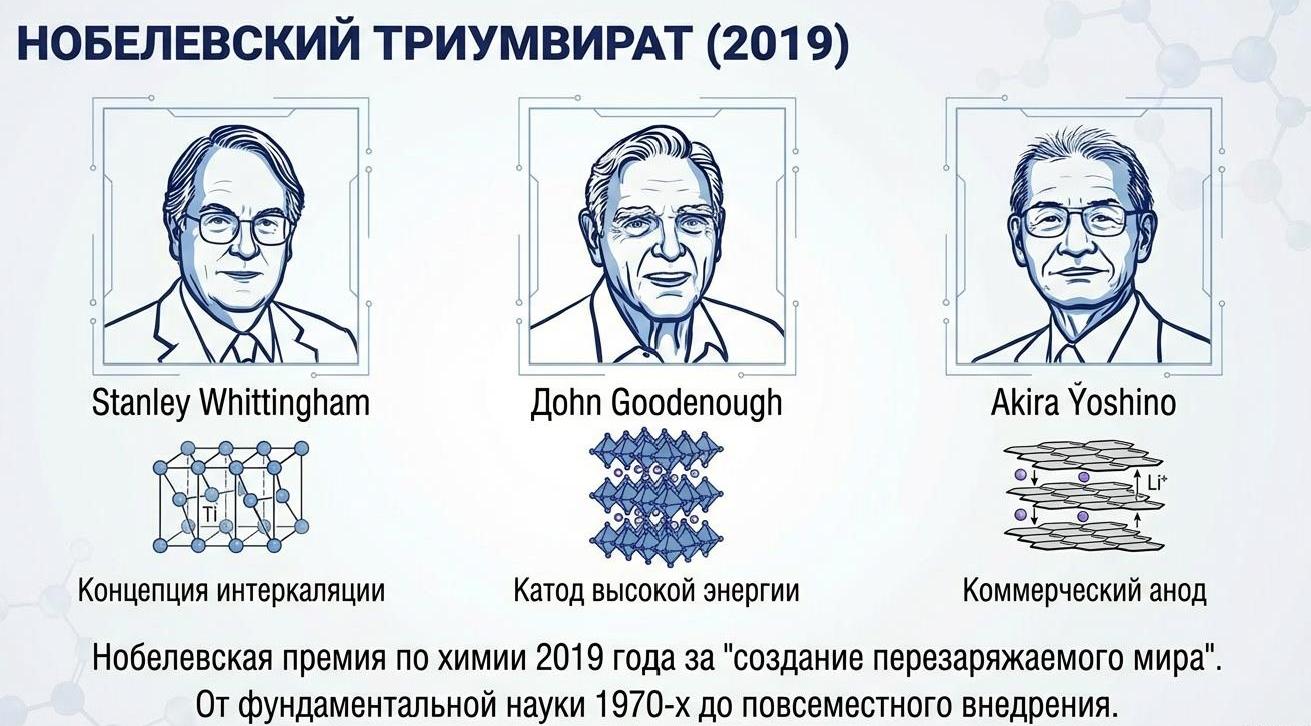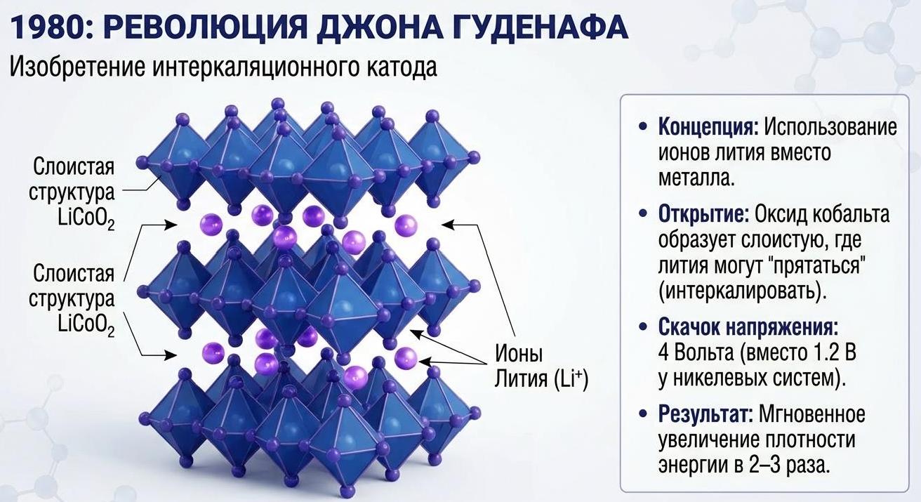 Революция в аккумуляторных технологиях началась в 1980 году, когда британо-американский физик Джон Б. Гуденаф (John B. Goodenough, 1922-2023), профессор Оксфордского университета, синтезировал катод из слоистого оксида лития-кобальта LiCoO2, ставший основой современных литий-ионных батарей.