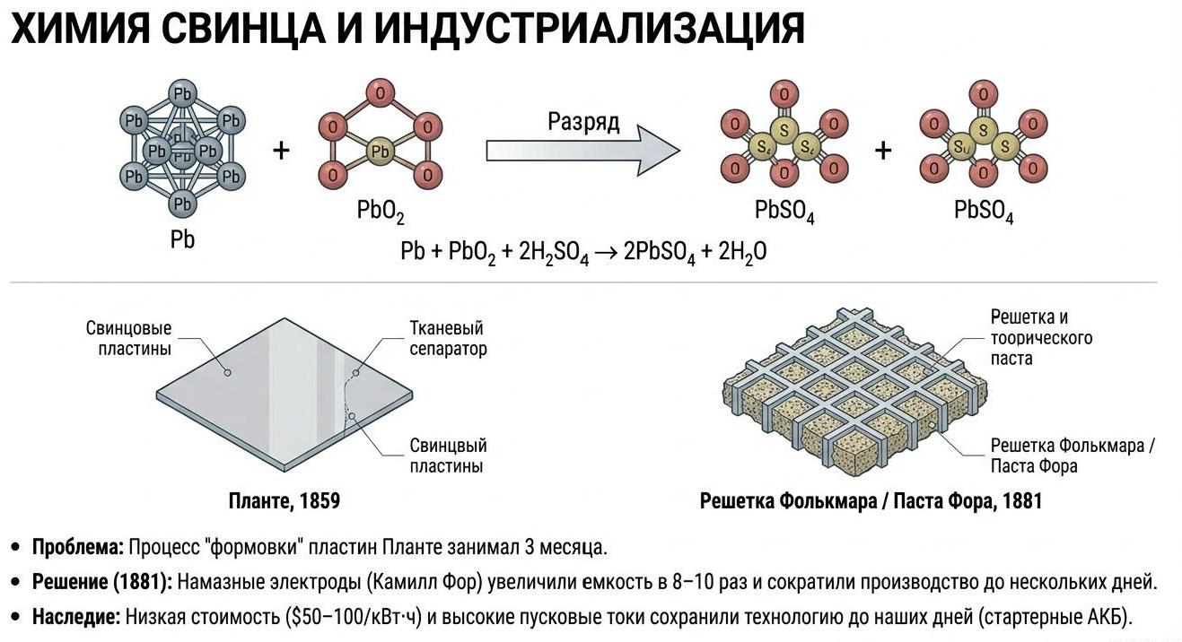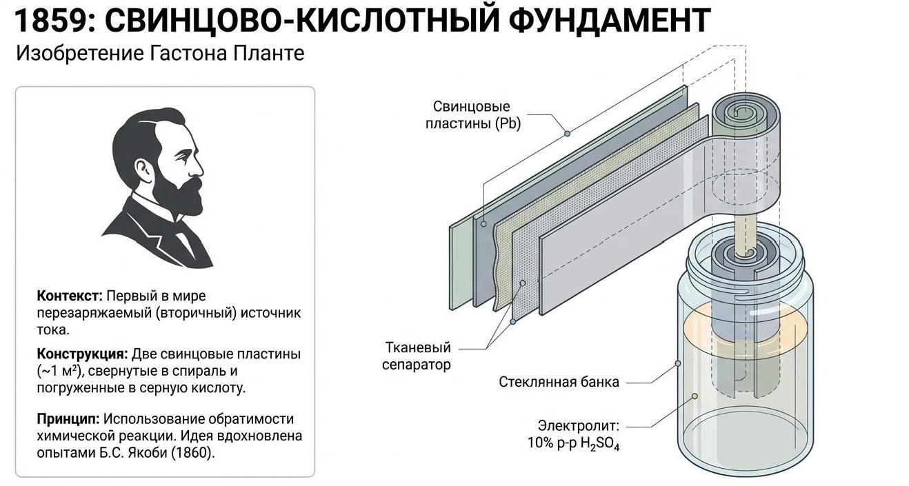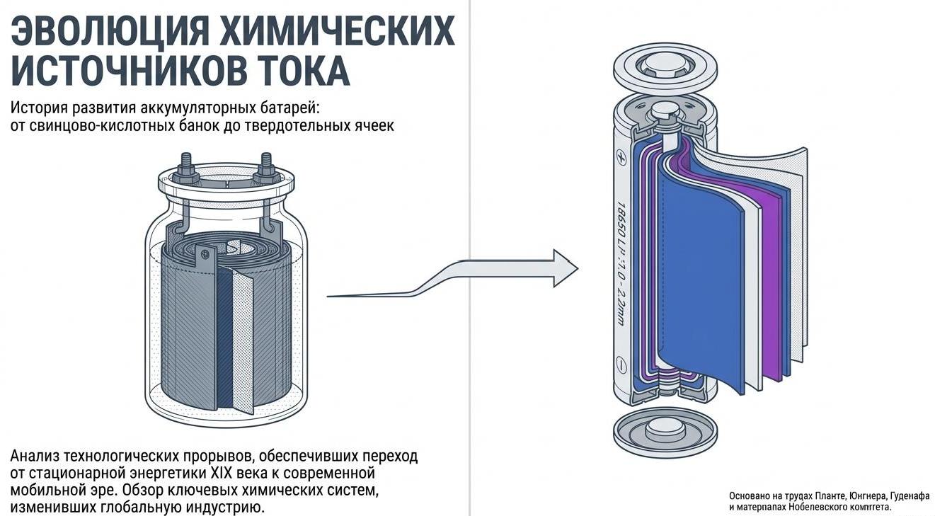 Эволюция от свинцовых "банок" Планте к твердотельным ячейкам революционизировала цивилизацию, обеспечив мобильность и связь.