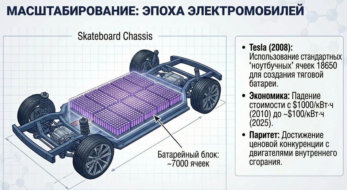 К 2025 году литий-ионные электромобили составили 15-20% мировых продаж (18 млн штук), вытесняя ДВС благодаря снижению стоимости батарей с 1000 долл/кВт·ч в 2010 году до 100-150 долл/кВт·ч в 2025 году - порог рентабельности.