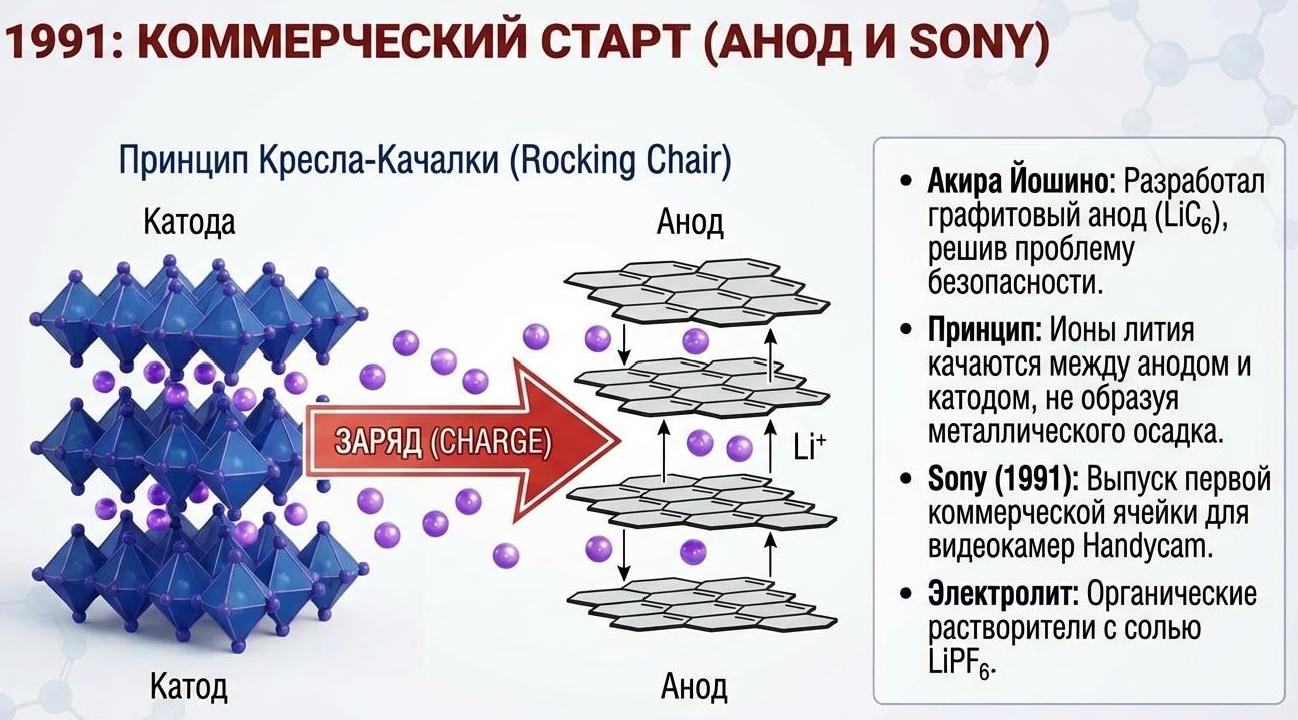 В 1980-х японский химик Акира Йошино (Akira Yoshino) из Asahi Kasei добавил второй ключевой элемент - графитовый анод, способный интеркалировать литий с емкостью 372 мА·ч/г по формуле LiC6, заменив опасный металлический литий. Он также разработал безопасный электролит на основе карбонатов (этиленкарбонат + диметилкарбонат) с солью LiPF6.
