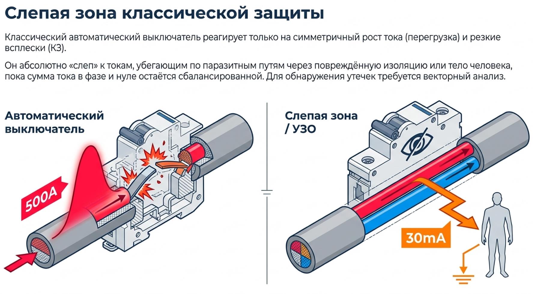 Автоматический выключатель по своей природе - токовый аппарат: он следит за превышением номинального тока (перегрузка) и за резким всплеском при коротком замыкании, отключая цепь тепловым и электромагнитным расцепителями. УЗО же «слепо» к симметричному росту тока, пока векторная сумма по фазе и нулю остаётся близкой к нулю. Оно реагирует только на небаланс.