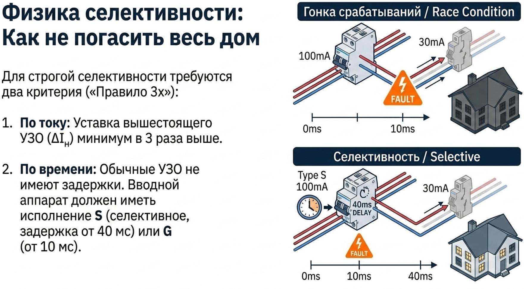 Однако чрезмерная чувствительность по времени и току приводит к постоянным ложным срабатываниям из-за естественных токов утечки длинных кабелей и импульсных нагрузок, поэтому в стандартах задают допустимые диапазоны времени отключения, а для селективных устройств дополнительно вводят намеренную выдержку времени.