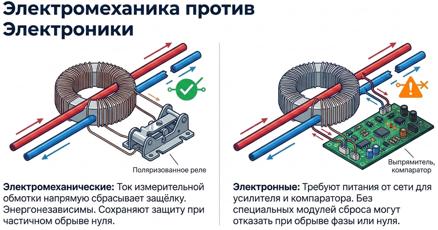 В электромеханических устройствах ток вторичной обмотки дифференциального трансформатора непосредственно воздействует на электромагнитный орган - поляризованное реле или магнитный толкатель - освобождающий защёлку механизма. Такие аппараты не нуждаются в дополнительном источнике питания и сохраняют чувствительность к утечкам даже при частичном обрыве нулевого проводника.