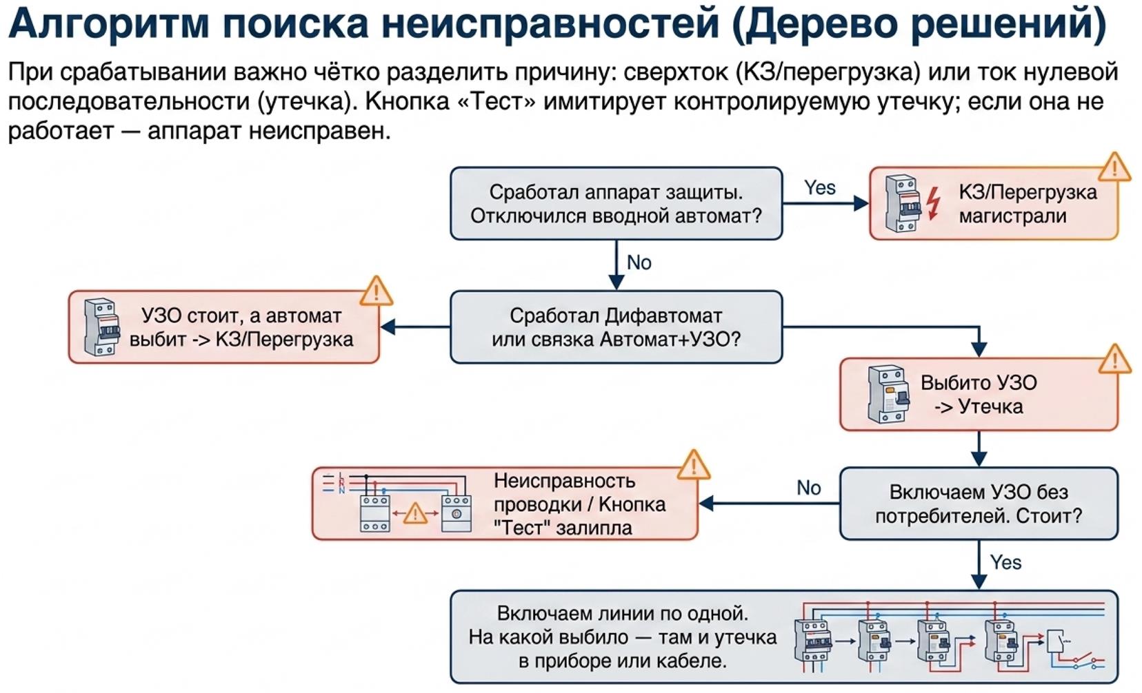 При срабатывании УЗО или дифавтомата грамотный алгоритм поиска начинается с разделения: аппарат сработал по утечке или по току перегрузки/КЗ. Если отключилось только УЗО при сохранении включённого вводного автомата, с высокой вероятностью причина - утечка. Если выбило и автоматическую часть, нужно проверять линию на короткое замыкание или серьёзную перегрузку.