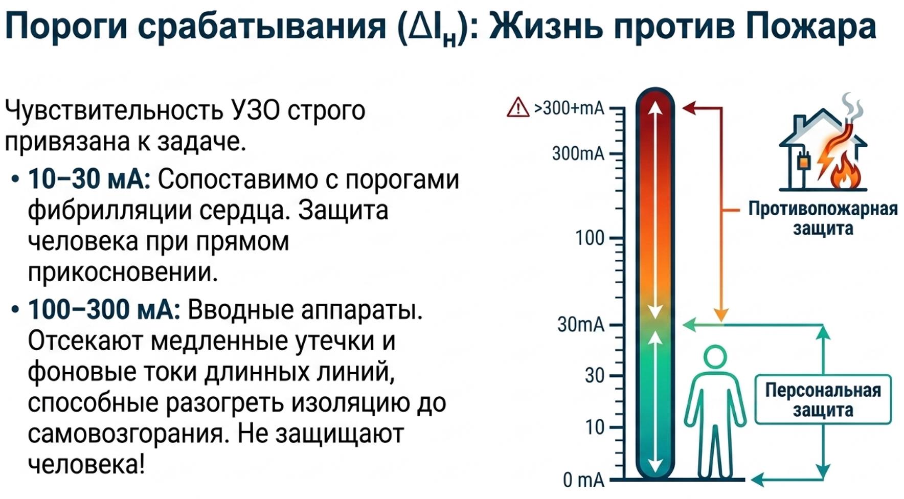 Для противопожарных УЗО на вводе характеристики другие - 100, 300 или 500 мА, поскольку задача уже не защита человека, а отсечение медленных утечек, способных разогревать изоляцию и пыль до самовозгорания.