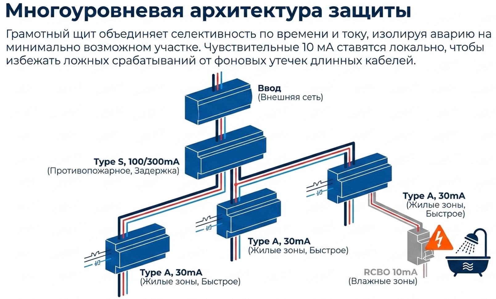 - вводное селективное УЗО или дифавтомат: 100–300 мА, тип A или AC в зависимости от состава нагрузок, исполнение S/G при необходимости селективности;