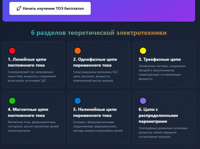 Интерактивное веб-приложение Обучение теоретическим основам электротехники (ТОЭ) — яркий пример такой трансформации. Это не просто сайт, где хранится учебная информация, а полнофункциональная интерактивная платформа, специально разработанная для глубокого и практически ориентированного изучения электротехники и смежных дисциплин. Ключевая идея этого приложения: каждый пользователь должен иметь возможность не только прочитать теорию, но и тут же экспериментировать с ней, получая мгновенную обратную связь.