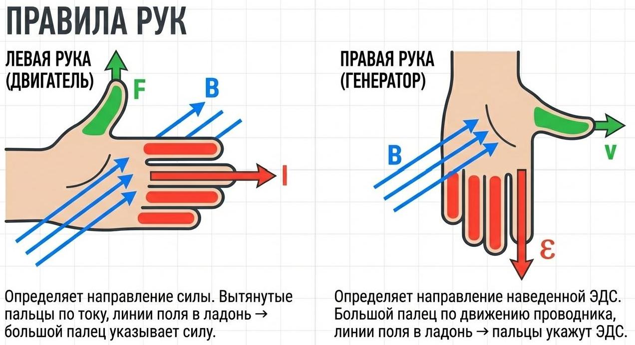 ПРАВИЛО ПРАВОЙ РУКИ — правило, позволяющее определить направление наведенной эдс электромагнитной индукции. Ладонь правой руки располагают так, чтобы магнитные линии входили в нее. Отогнутый под прямым углом большой палец совмещают с направлением движения проводника. Вытянутые четыре пальца укажут направление индуктированной эдс.