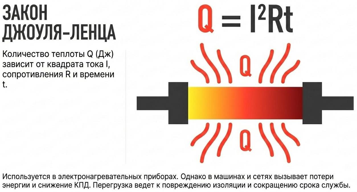 Согласно закону, количество теплоты Q (в джоулях), выделяющейся в проводнике при прохождении по нему постоянного электрического тока, зависит от силы тока I (в амперах), сопротивления проводника R (в омах) и времени его прохождения t (в секундах): Q = I2Rt.